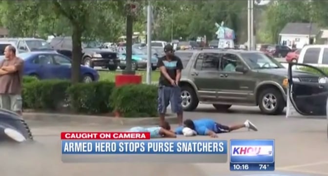 In Texas, a woman was a victim of an attempted purse snatching in a parking lot. All of a sudden, a good Samaritan with a concealed firearm stopped the robbery and held the suspects at gunpoint until police arrived.