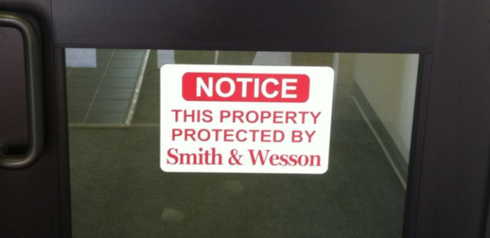 South Porte Bank, owned by 92-year-old veteran Thomas Throgmorton, put up signs at each of their banking locations that say “NOTICE: THIS PROPERTY PROTECTED BY Smith & Wesson”. Well done Sir, well done.