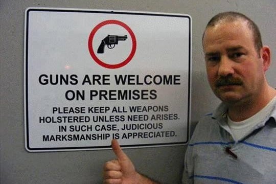 Sharma Floyd, the owner of Shiloh Brew and Chew in Maryville, Tennessee, hung a small sign in the window of her restaurant informing customers that guns are welcome on the premises. Subsequently, a local news team reported a story on the restaurant owner’s policy, which then caused a spike in business, predominantly due to the influx of clientele who carry concealed weapons. Floyd says, “I believe in the right to bear arms, and as a small business owner, who am I to take it away?”