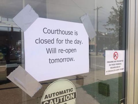 It seems that during this meeting, there were no legally armed individuals present. If it’s anything like the town I’m in, it is illegal to carry your firearm inside the courthouse. Actually, take a look at the image above. See that ‘no firearms’ sign to the right? Everyone in that room is lucky that Koos sprung into action as quickly as he did. Had he not, mixed with no one else with a firearm in the room, bodies could have started to pile up.