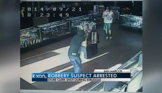 A 20-year-old tough guy decided to rob the Gotta Habit Smoke Shop near Texas State University, but the employee wasn’t going to have any of that. As soon as the robber points his firearm at him, the employee gets behind a display and crouches down. Then, he charges through the display and heads directly for the thug. A fight ensued and the robber ended up firing a round which hit the employee.