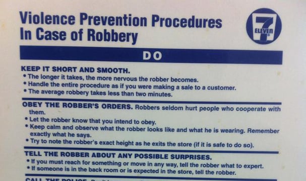 It’s no secret that the 7-Eleven chain has been on the NRA’s list of “anti-gun” companies, and it’s also no secret that the name 7-Eleven and armed robberies go hand-in-hand. What may be somewhat of a secret — and a little surprising — are the recommendations that 7-Eleven gives their employees on their “Violence Prevention Procedures In Case of Robbery” flyer that is hung in their bathroom.