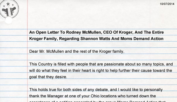 As many know, this campaign began after an old photo surfaced of a man open carrying a firearm in one of your stores. The fact that the man and the organization he belongs to have since changed their policies has had absolutely no effect on the campaign targeting Kroger that was started by MDA.