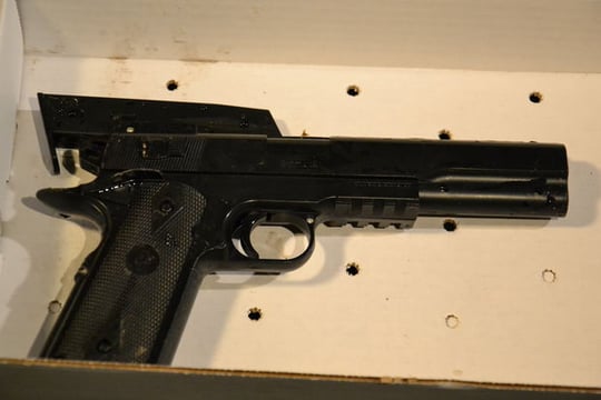 According to police, a 911 call was made that described a person with a gun. When police responded to the area, they found a group of people sitting under a pavilion. Police noticed what appeared to be a handgun on one of the tables, and witnessed one of the people pick it up and put it in his waistband.