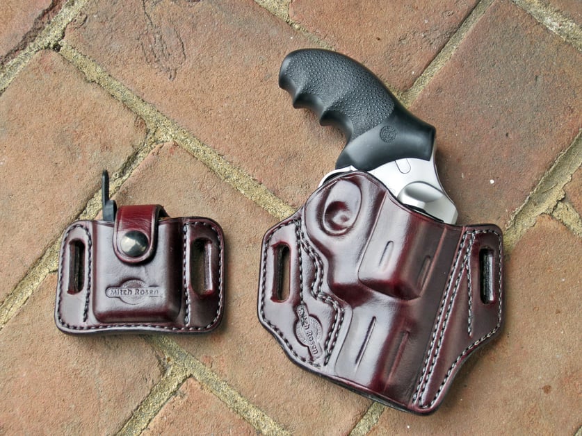 The author’s personal Ruger SP101 in a Mitch Rosen 5JR holster. Note the aftermarket grips which soak up the stiff recoil of the .357 Magnum. Extra ammo is carried in a speed strip on the belt carrier.
