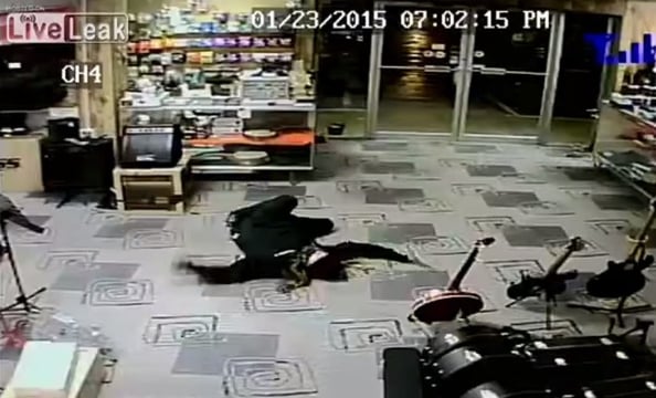 The video above supposedly shows an attempted robbery where the store owner draws a big ‘ol revolver from behind the counter when a man tries to rob him. A second later, the robber falls back and ‘plays dead’ before ultimately getting up and running out the door.