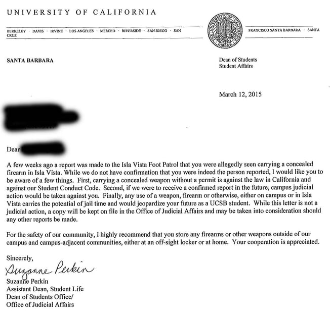 I thought that was the end of it, but most recently I received the attached letter (above, click to enlarge) from the Assistant Dean of Student Life accusing me of carrying one of my guns around Isla Vista.