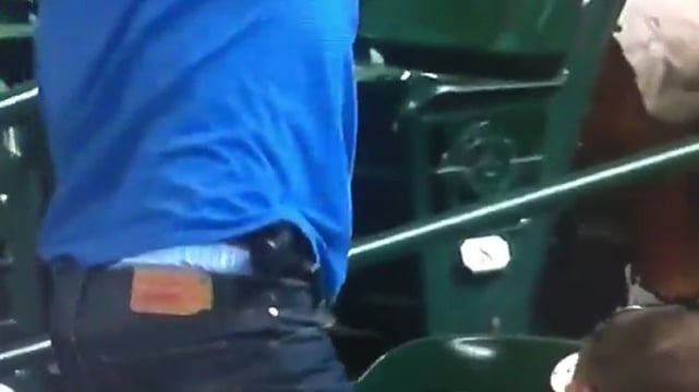 In Texas, it’s illegal to carry concealed at a professional sporting event. The first thought that came up was; maybe he’s an off-duty police officer. Upon closer inspection of the video, the man doesn’t seem to be wearing a belt. You can, however, see the clip of his holster. With this information, I’d venture a guess that he’s not law enforcement, as anyone that routinely carries a firearm would know to use a belt with their holster for proper concealment.