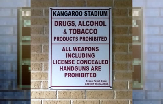 A 39-year-old father of a newly matriculated student will be facing third degree felony charges following a negligent discharge when he absently reached into his pocket. The location was the Kangaroo (“Roo”) Stadium at Weatherford High School — which is lawfully designated a firearms free area. Whether or not a concealed carrier (or a criminal) personally agrees with that policy is another matter entirely. Unfortunately, this concealed carrier is about to get a taste of Texas law because of that disagreement.