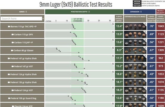 This is one area where we intentionally deviated from the typical FBI test. Ballistics testing is most often conducted with full size or “service size” handguns with barrel lengths of at least 4”. However, most armed citizens carry smaller guns with shorter barrels, which means the bullets they fire will fly at a lower velocity than what is advertised by the ammo manufacturer. Ballistics data gathered using full size barrels can be misleading if applied to these small concealable pistols. We ran our tests with popular concealable handguns with barrel lengths we think are more representative of what the average citizen is actually carrying.