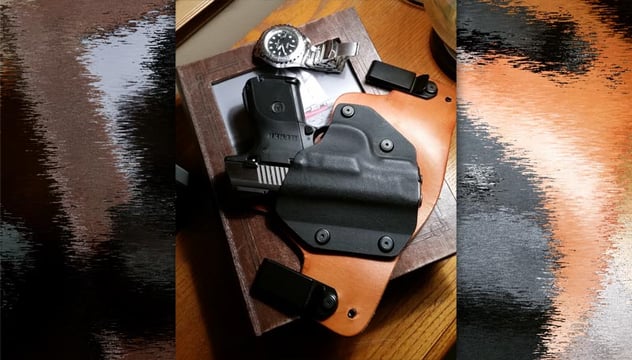 I carry a Ruger SR9c in an Old Faithful “inside the waistband” holster. The reason I carry that Ruger, is it has a record of reliability and I love that it’s chambered for the 9 millimeter. The reason I use the Old Faithful holster is, the company gives you the option  of actually building your own rig and saving money.