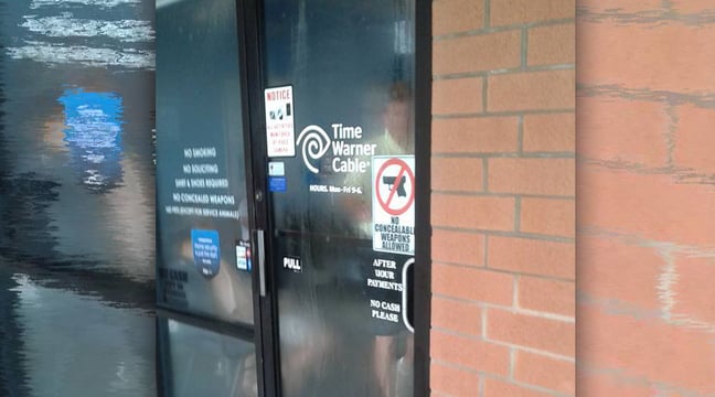 While this isn’t a new story, it was brought to light again by a reader who snapped the above photo when he went to disconnect his Time Warner Cable service. Their policy of ‘no guns’ has been in effect for some time, so I decided to reach out to them myself and make sure they’re still sticking to their guns. Oh, pun!