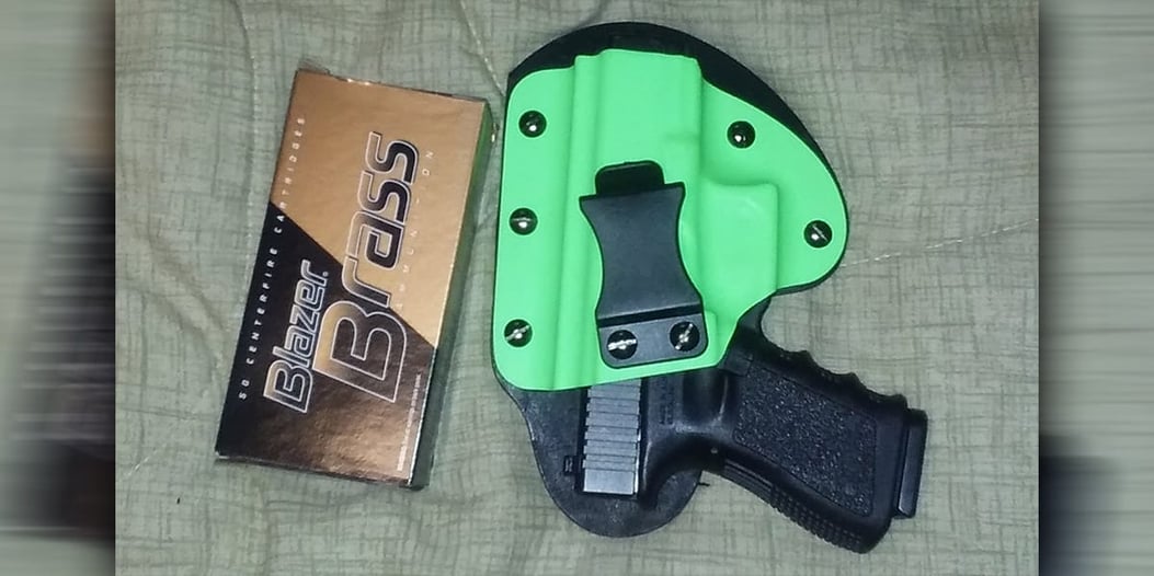Glock 23 in a iwb Raw Dog tactical holster and because it conceals very well and is very comfortable.