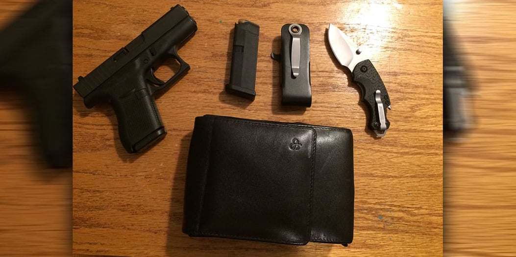 1. I carry the Glock 42 along with an extra mag in a snag mag magazine holder. I also carry a Kershaw folding knife.