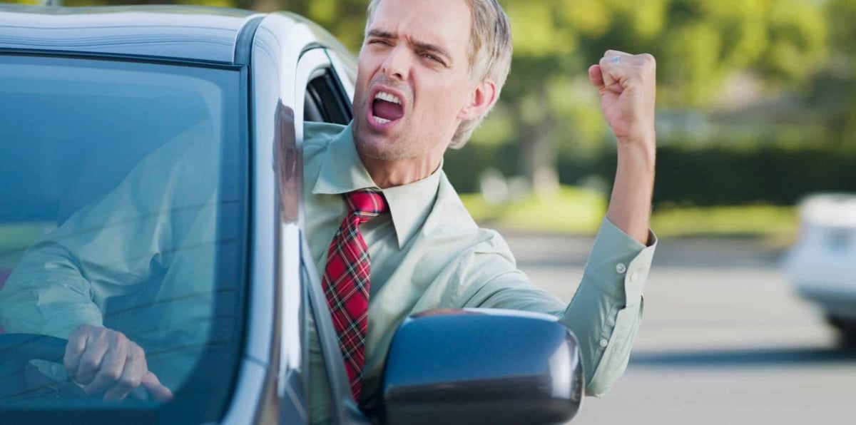 If this happens, there really isn’t anything going on besides an angry person letting you know that he’s pissed. Window up, and try to drive away if you can. If not, stay in your car and call 911. Keep cool and hopefully the dude will just get tired and leave.
