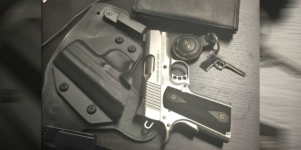 Kimber Ultra Carry II .45. All three fingers fit on the grip without a magazine extension.