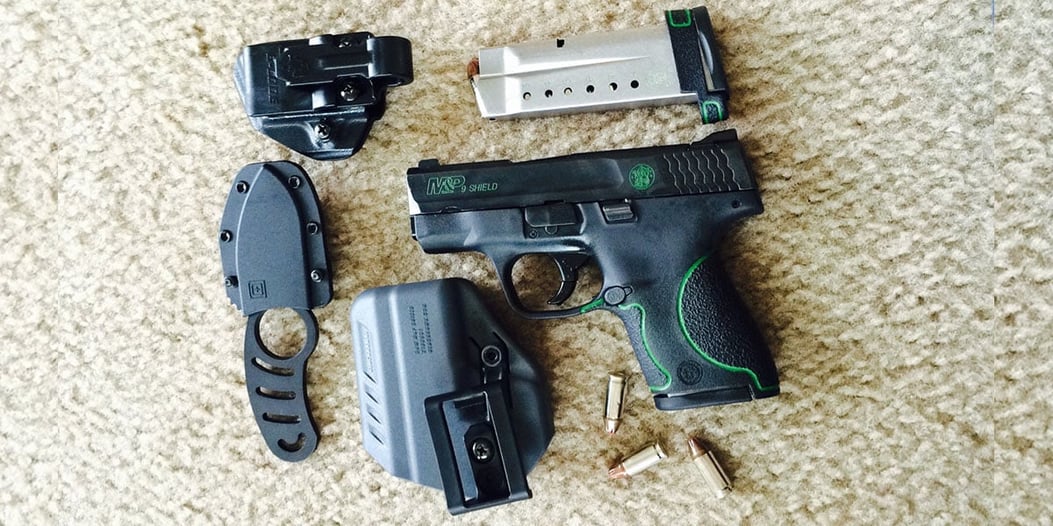 My name is JD, and my EDC is my M&P Shield 9 with Critical Defense ammo. I carry in a BLACKHAWK! A.R.C. holster. I like the A.R.C. because it’s very low-profile, customizable, and crazy comfortable at the 1 o’clock position. I also carry a backup mag in a G-Code mag caddy, and a 5.11 Tactical Side Kick.