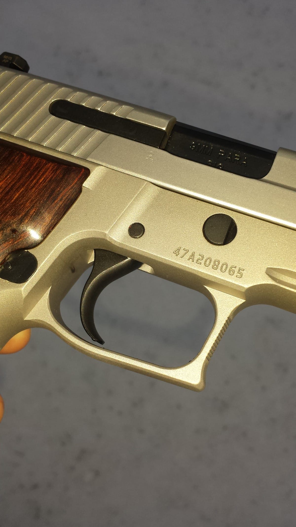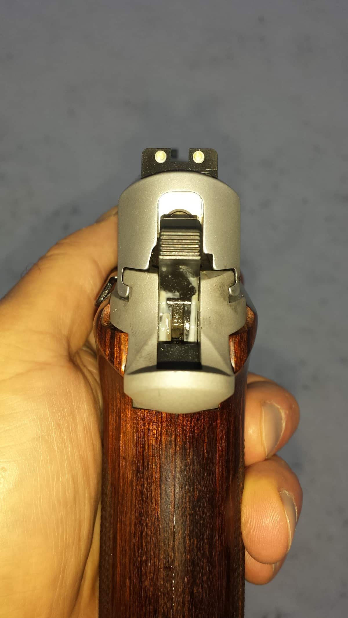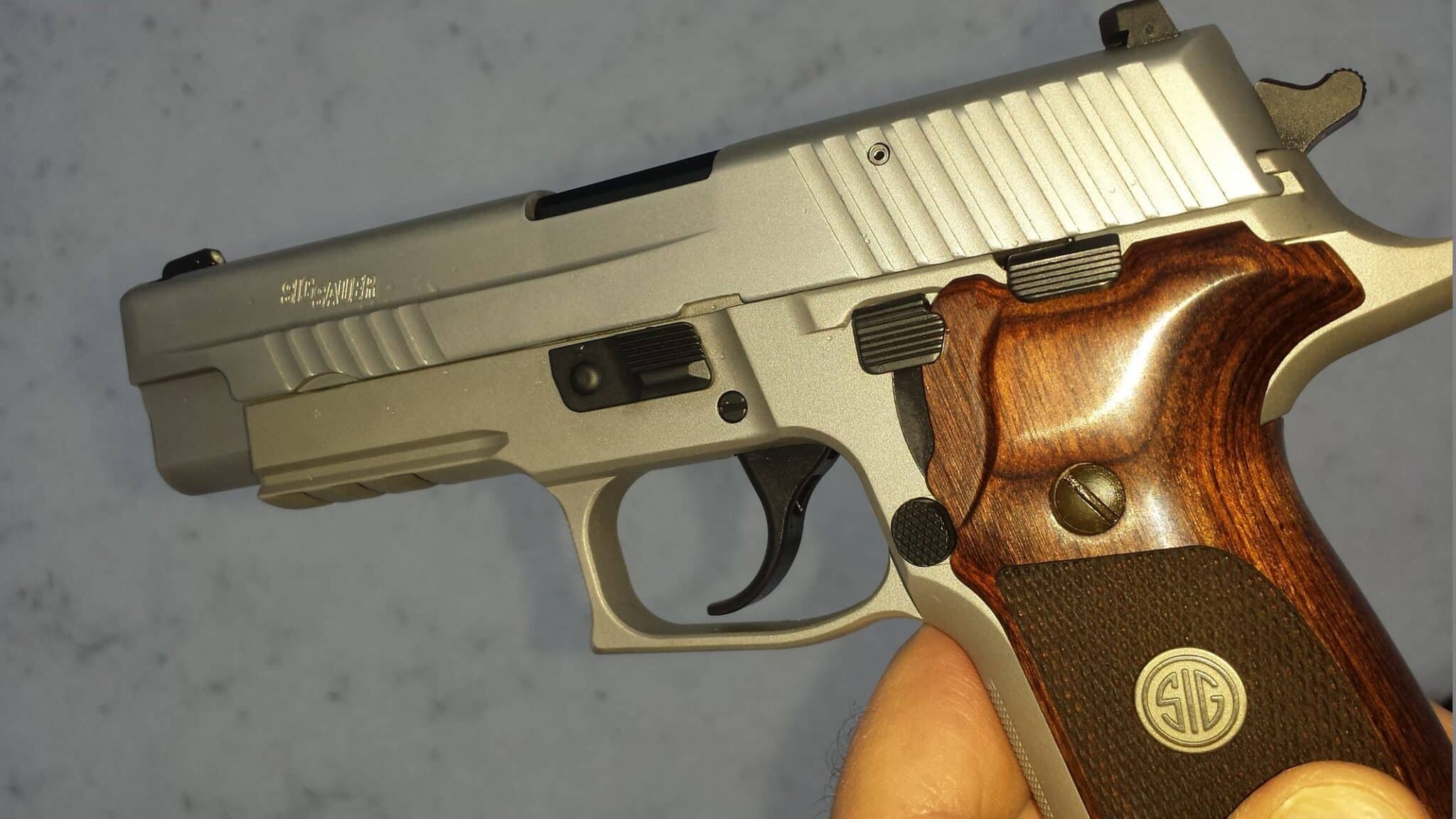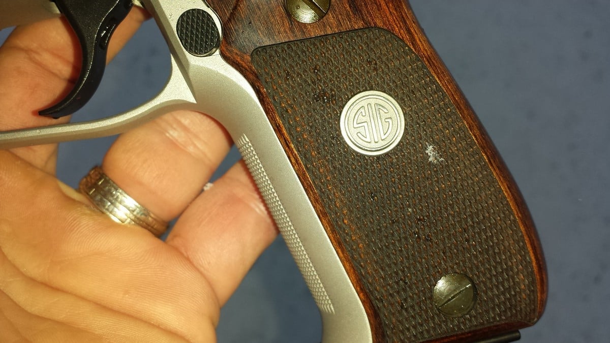 Another beautiful addition on the TALO model is the custom walnut grips. The grip features a single wood piece surrounding the handle enriched with a dark rosewood finish. It has deep diamond checkering on the grip panels along with an appealing “SIG” medallion in the center. It is definitely a thick grip as the girth feels wide however the thickness works well for this model. The grips offer beauty and function as the ergos feel just right.