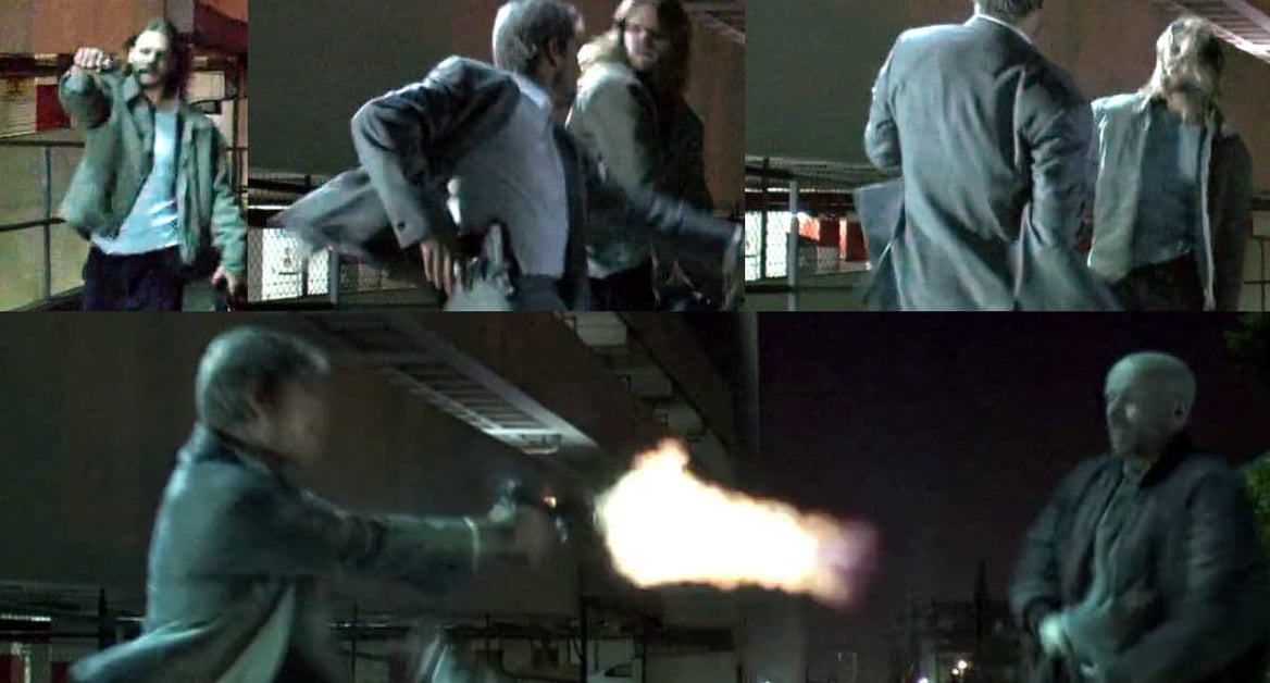 In the movie, Vincent pushes the main antagonist’s gun to the side with his non-dominant hand and swings his hips back to give his dominant hand access to his handgun. This also gives him a very brief angle to move his head out of the way of the barrel of his opponent’s gun.