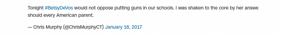 Senator Murphy quickly took to Twitter to let everyone know how troubled he was that a nominee for the Secretary of Education wanted to leave decisions about safety up to the school districts who better understand their communities.