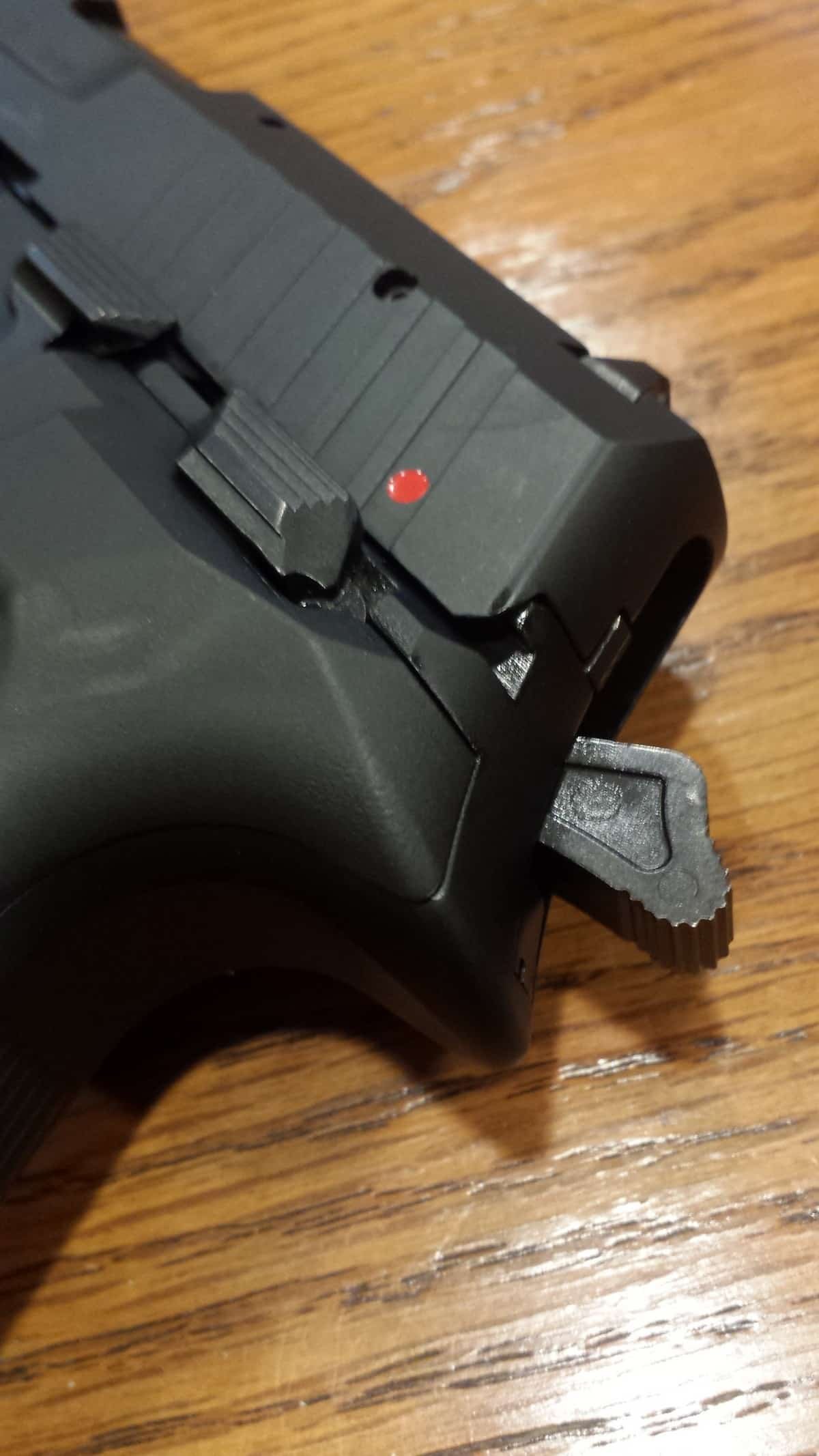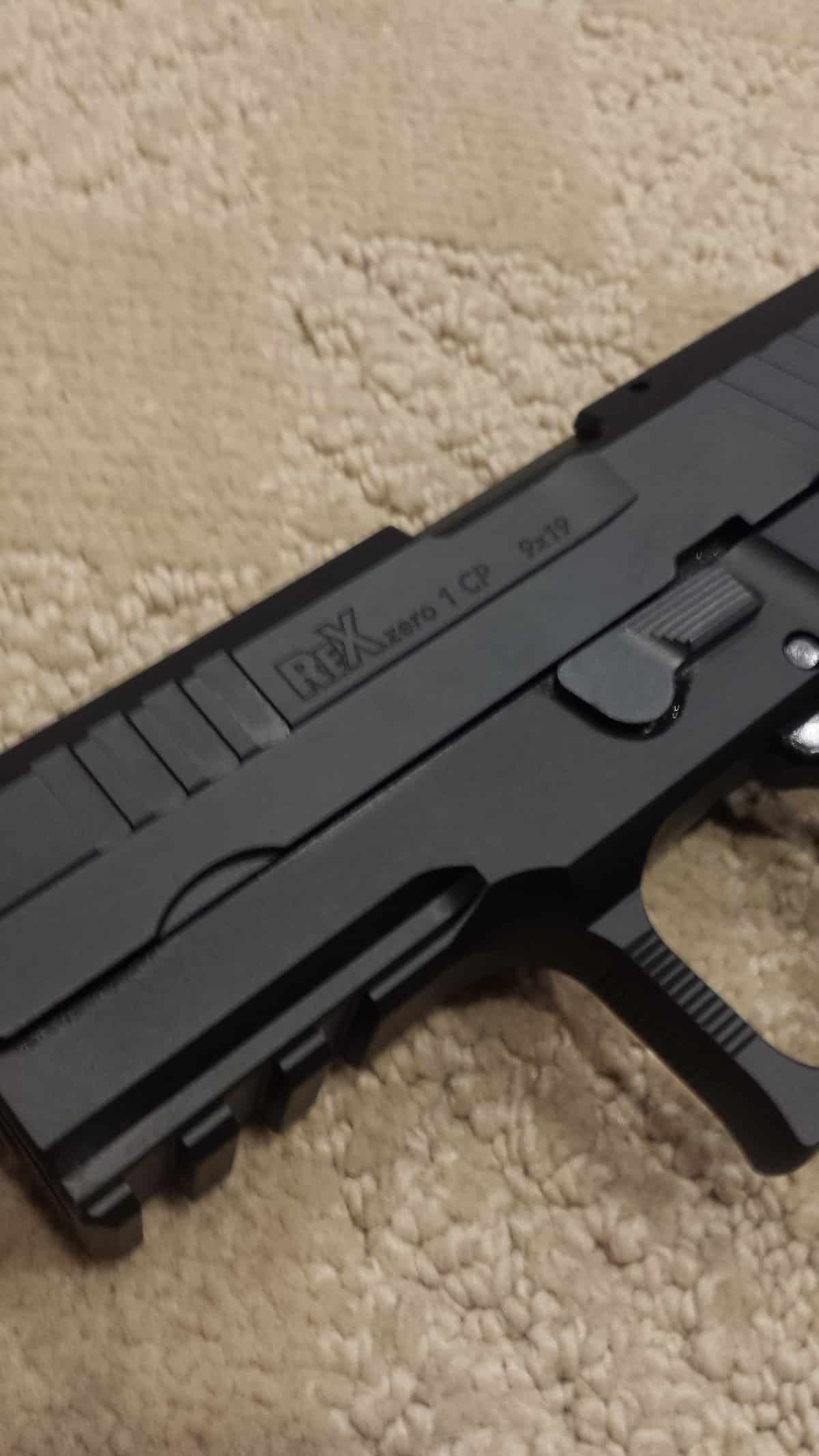 To disassemble the Rex Zero 1 is an easy process that requires no tools. Once assuring the gun is unloaded along with removing the magazine, lock the slide back, push down the takedown lever to release the slide and remove the upper assembly with no need to pull the trigger. One will notice the full length frame rails that connect the slide. Then remove the uncaptured recoil spring and metal guide rod and then the 3.85 inch barrel. The pistol is then completely field stripped. To reassemble, simply perform the same steps in reverse order. It is worth mentioning that once the slide is positioned on the frame, by pulling back on the slide will automatically turn the takedown lever in horizontal position which locks the slide in place (see video).