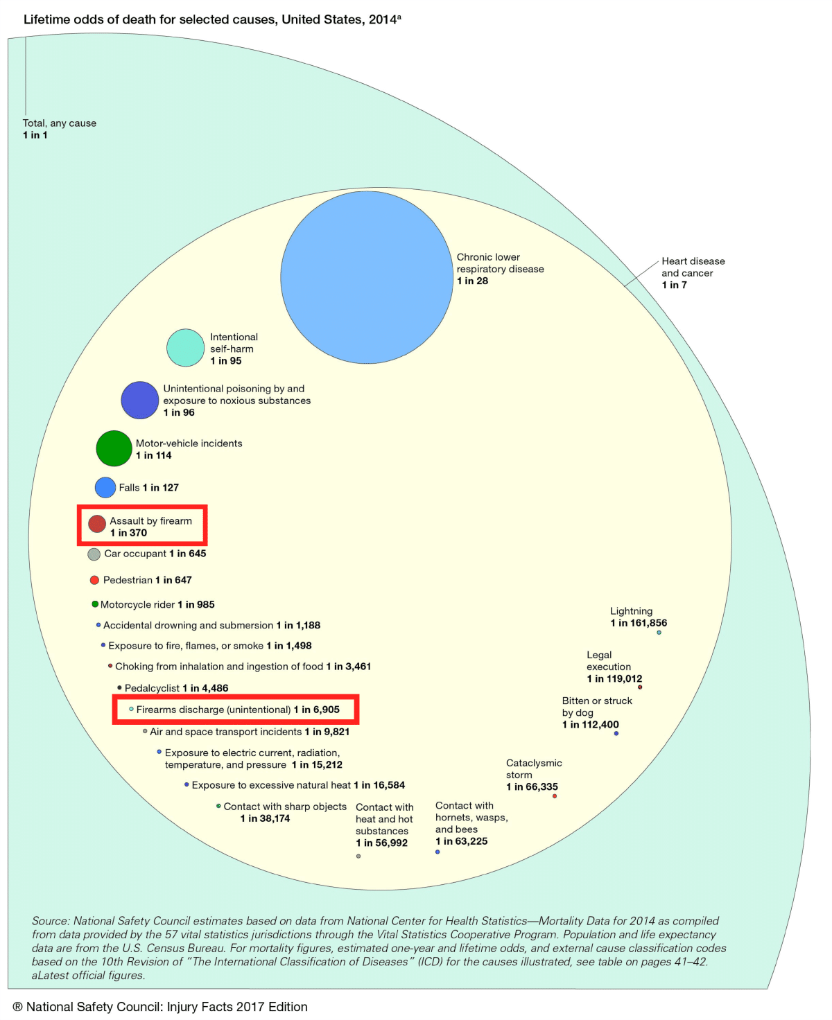 However, before we get caught up in that, we have a second figure that needs attention: death by assault with a firearm. The 2014 numbers from the NSC show that 1 in 370 people will die due to getting assaulted with a firearm. That number was quite a bit larger than I had anticipated.