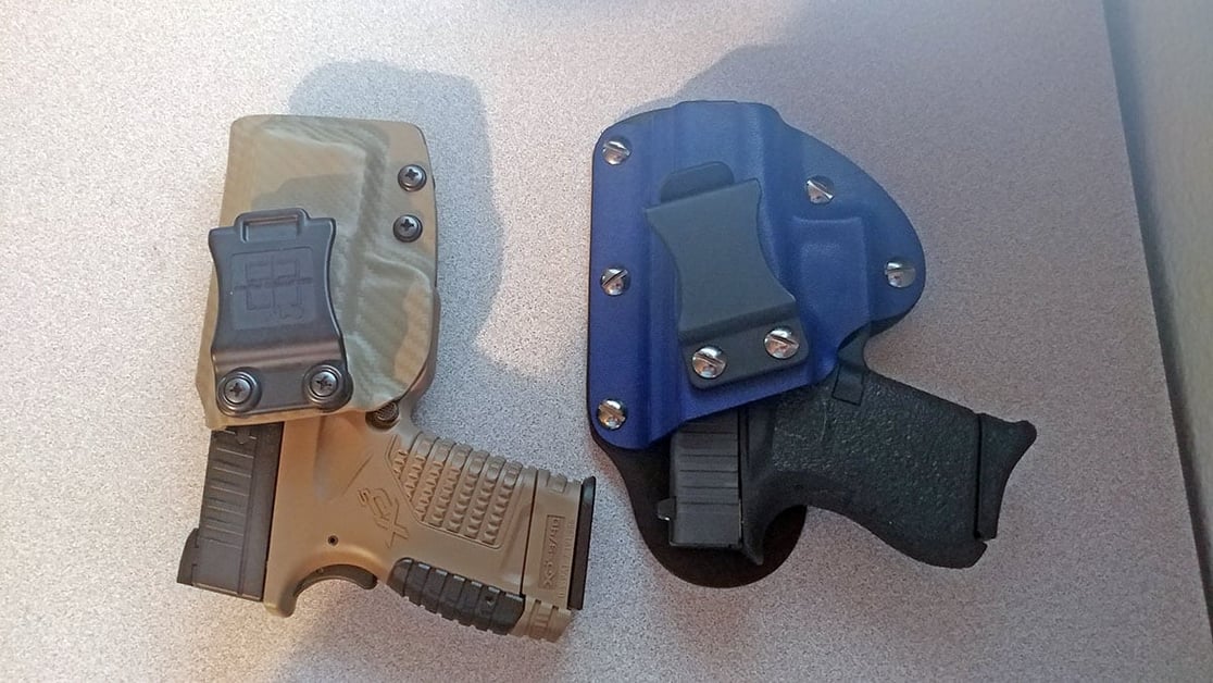 2. Squared Away Customs Carbon Fiber, Flat Dark Earth IWB Holster, Raw Dog Blue IWB Holster