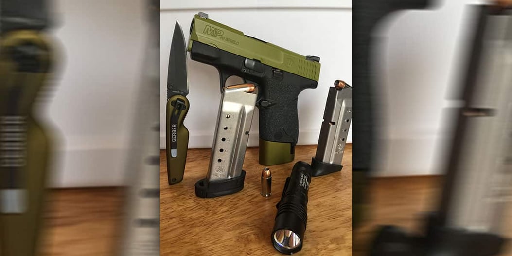 I carry a .40 caliber Smith and Wesson M&P Shield tucked in an Alien Gear 3.0 at the 4/5 o’clock position. I work a desk job and it sits there comfortably for 9 hours a day. The gun and holster both are not only incredibly priced, but the quality is there too. The Shield fits my hand great and with the aftermarket add-on’s it is super easy to shoot accurately, even with a snappy round like the 40s&w. Here’s a pic of everything in my EDC kit except the holster.