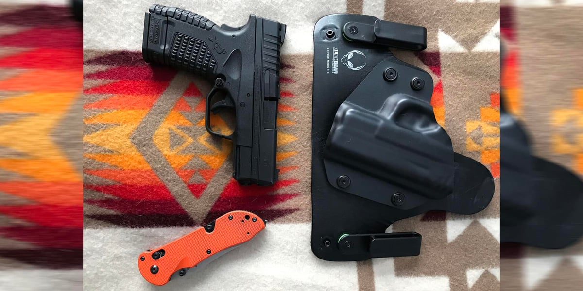 Gun: Springfield XDS 9mm, along with Benchmade Traige knife