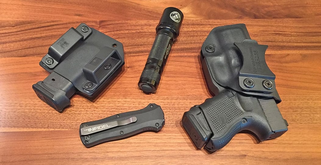 Mike’s Glock 26 in an Alpha Concealment IWB “Prometheus” holster with soft belt loops, and an extra MAGPUL mag in a Bravo Concealment carrier. The holster is comfortable, adjustable and easy to take off. Also shown is my Infidel knife and my military SureFire light.
