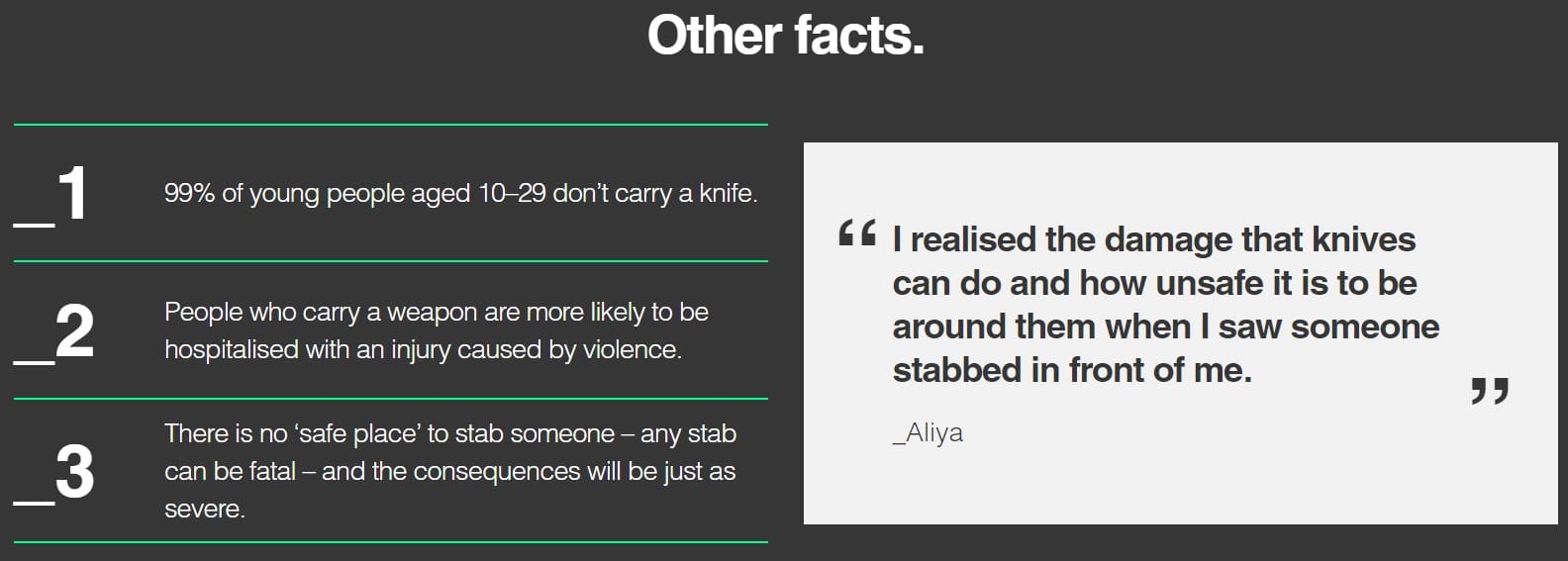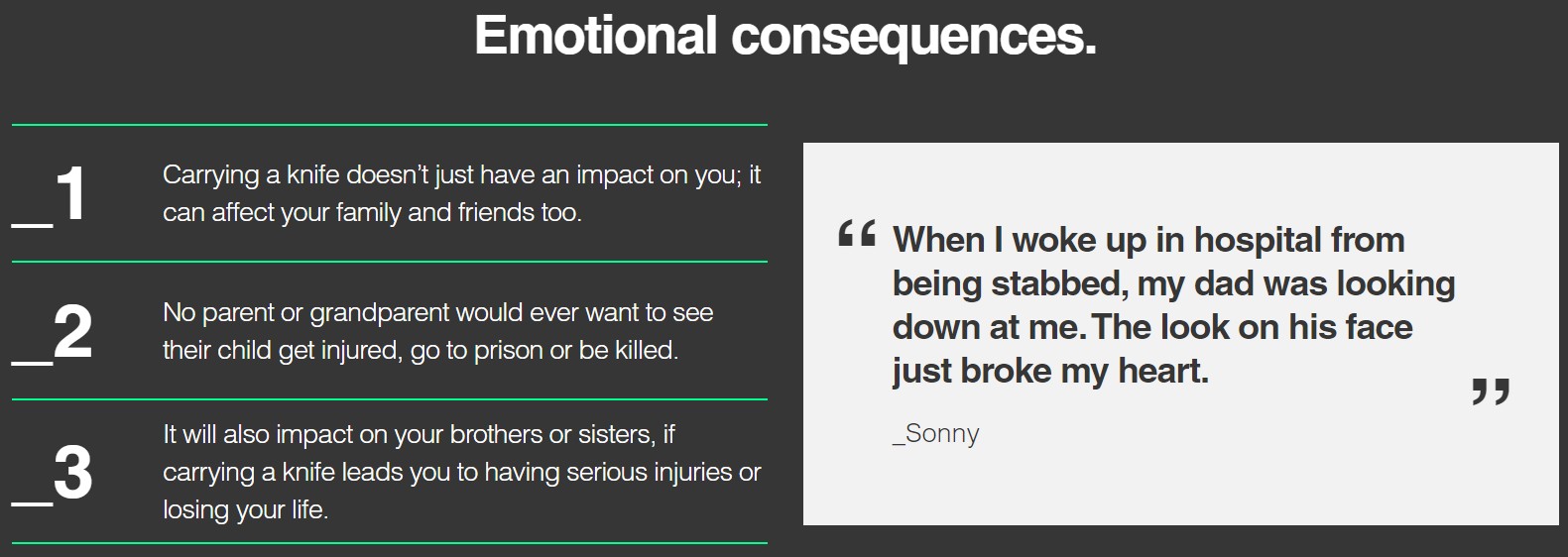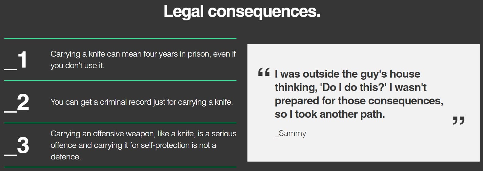 That’s right; up to 4 years in prison. Each of these sections on the site has a quote next to it, and they’re kinda ridiculous. This one is apparently from a person named Sammy, who had a fleeting thought about going to someone’s house and stabbing them. He chose not to continue with what he was going to do because he “wasn’t prepared for those consequences”.