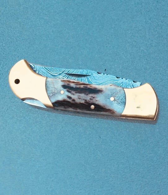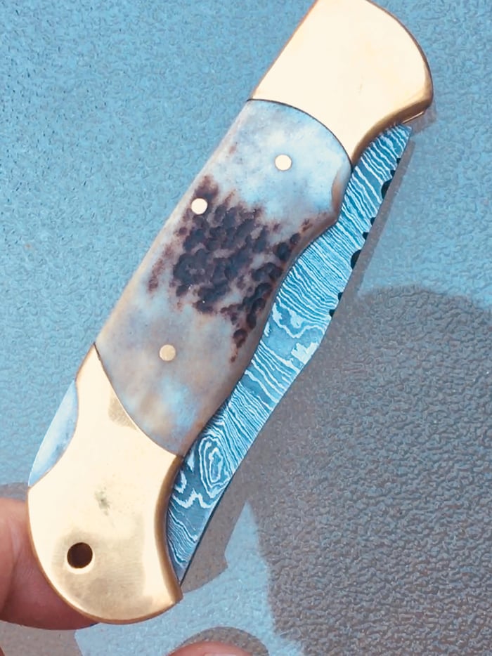 Introducing the SZCO Lockback With Genuine Stag Handles and Damascus Steel 3.25″ Clip Point Plain Edge Blade, as the incredibly long Smoky Mountain Knife Works title reads.