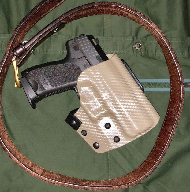 I carry an H&K USP compact in a JM Custom Kydex “OWB 2” holster with 10 degrees of cant, on a 1 1/2” Mitch Rosen belt.