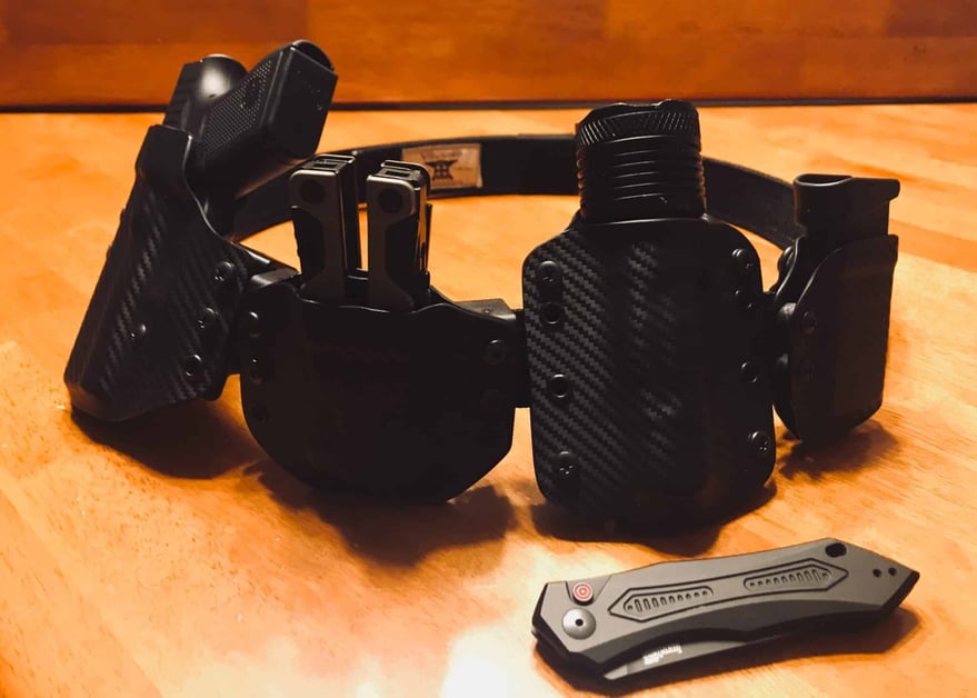This is a Glock 43 in a Great Lakes Holster. Along with that is my flash light, multi tool and extra mag all in Great Lakes custom holsters. The gun belt is a Volund Gearworks G Hook Belt. The knife is a Kershaw Launch 6.