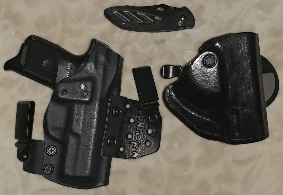 Ruger SR9c in a Clinger V3 No Print Wonder IWB holster while in SC and a Bianchi Paddle Lock OWB holster when I leave my home state and travel where the 2nd A is treated with more respect. The SR9c is a comfortable double stack in the V3.