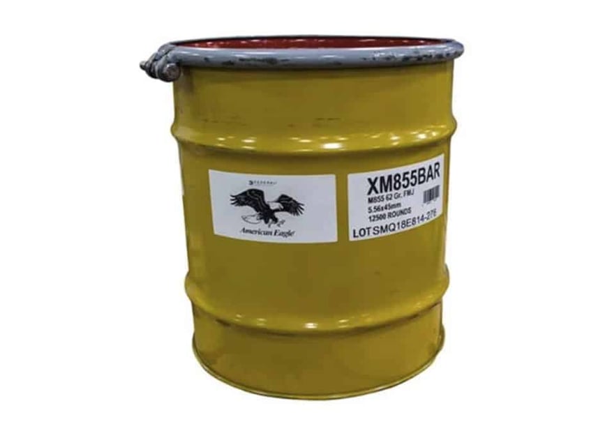 Filled to the brim with either 12,500 rounds of XM855 5.56mm NATO, or 7,500 rounds of XM80 7.62X51 NATO ammunition, the metal Bulk Barrels are painted an attractive, eye-catching shade of yellow and sport a patriotic image of a majestic American bald eagle soaring on outstretched wings, its talons fully extended.
