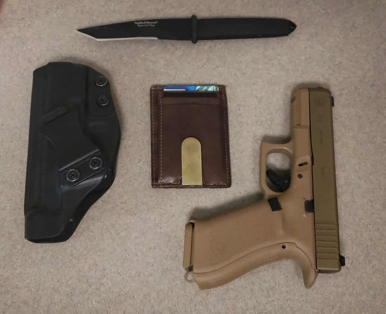 Glock 19x in a Clinger holster. I carry this gun because it is my only handgun and only holster I have at the moment. Though it’s not a bad holster.