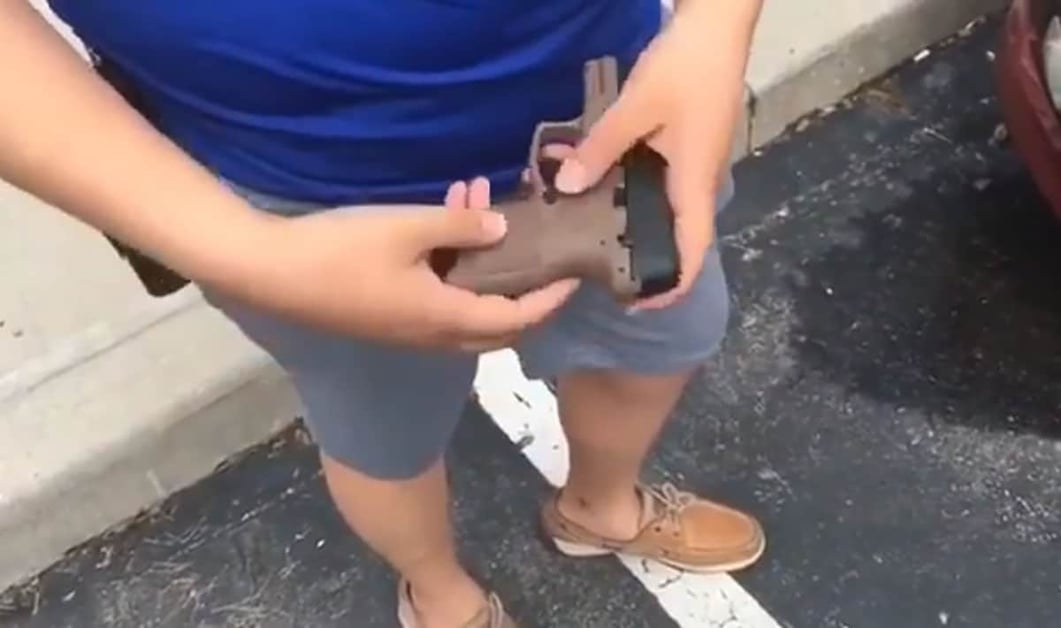 What appears to be a news channel interview, a woman shows the reporter her firearm after being asked what kind it was.
