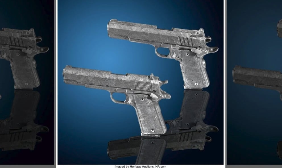 Constructed from part of the Muonionalusta Meteorite, which was discovered in Sweden in 1906, the working .45 caliber pistols offer an unusual take on the classic 1911 handgun design. Experts believe that the meteorite slammed into Earth about 1 million years ago, although the meteorite itself is thought to date back some 4.5 billion years.