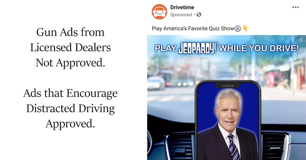 Nearly 5,000 people were killed in automobile accidents that resulted from distracted driving in 2018. An estimated 391,000 others were injured. In a world where everyone has a cell phone, it’s big money. A company reaching for that money seems to be Facebook, as they’ll have no problem approving an ad that blatantly promotes being distracted while driving.