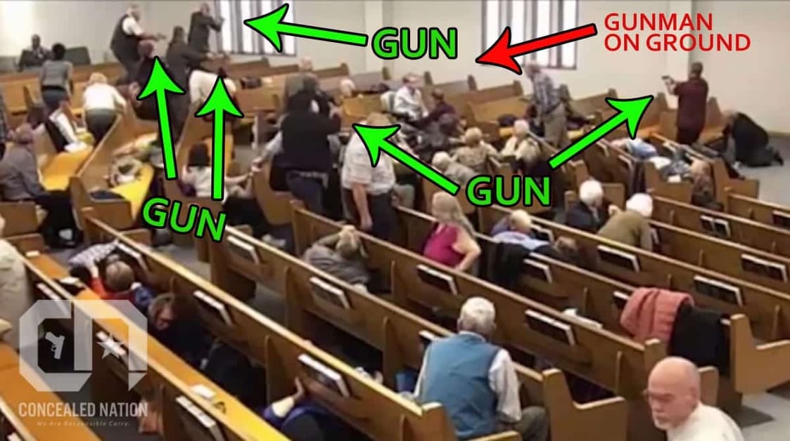 In an incident that could have been much worse in Texas Sunday morning, surveillance video shows at least 5 churchgoers drawing their firearms and pointing them at a suspect who had just opened fire during the morning service.