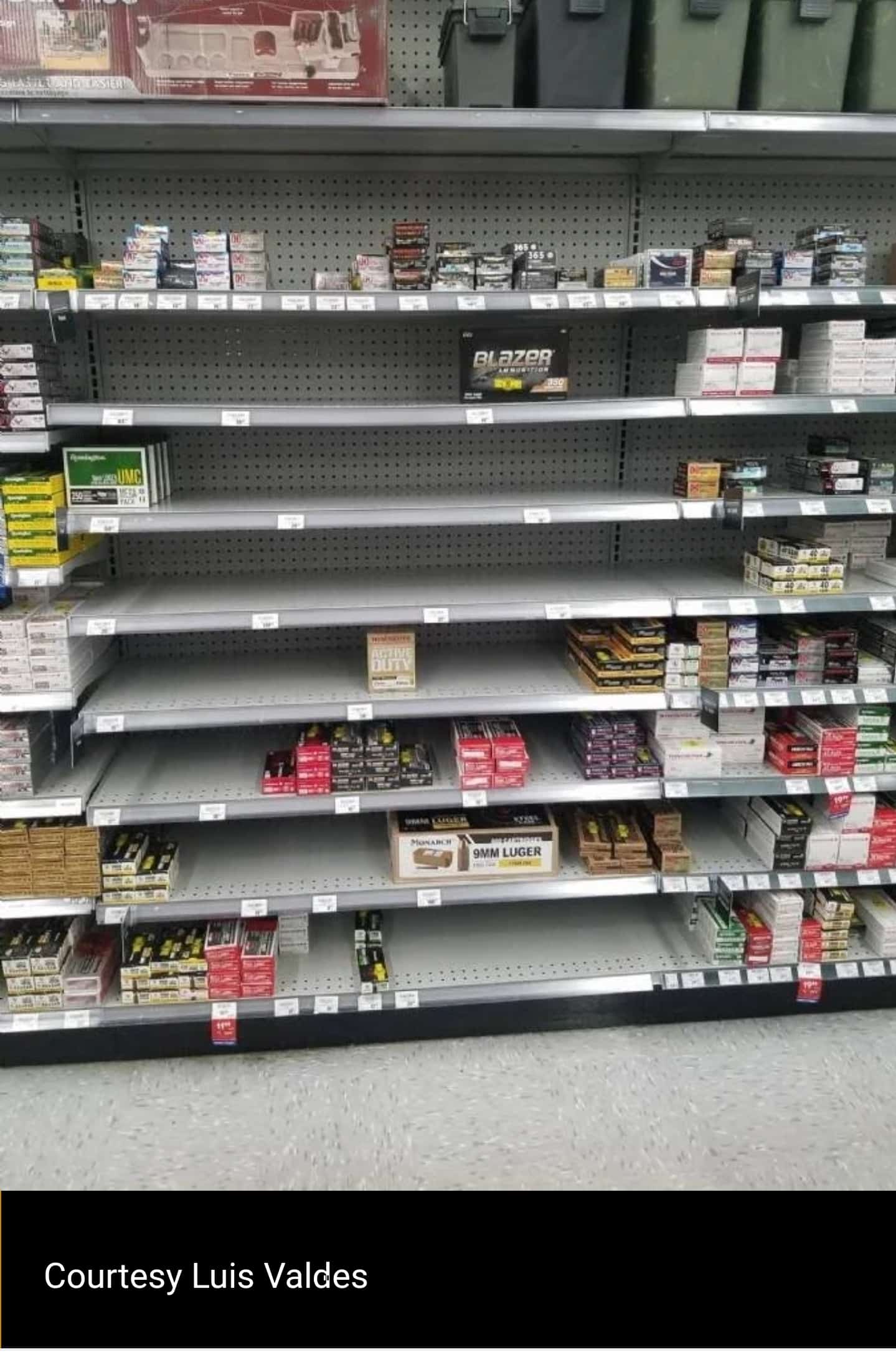 This photo was snapped this morning by TTAG contributor Luis Valdes at his north Florida neighborhood Academy Sports store. As he reports, he “went to go get a set of weights and the ammo/gun department is being stripped clean.”