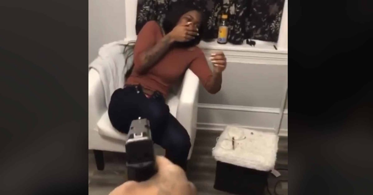 The video, which can be seen here, shows a man firing a handgun into the wall just a few feet from the woman’s head. He then points it directly at her, loaded, while continuously asking her “Are you gonna have my baby?”