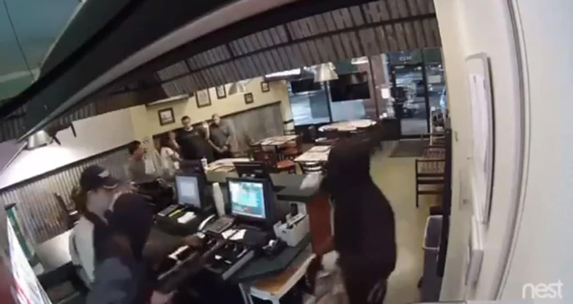 The customer against the wall, 2nd from the right, draws his handgun as the robbers leave the restaurant. His light pops on, he racks the slide, and lets off 8 rounds in just a few seconds.