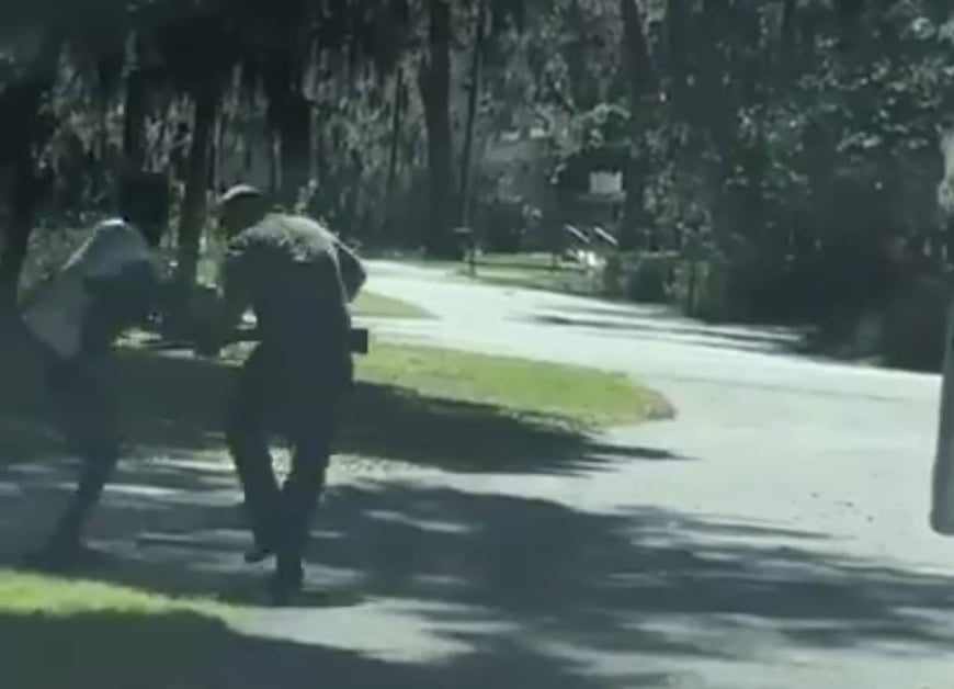 A black man can be seen in the video running at a slow pace toward a white truck that is stopped in the middle of a country road. Two men are seen outside the vehicle, including one standing on the truck’s bed. The black man seems to attempt to run around the truck, and the moment he clears the vehicle, a shot rings out.