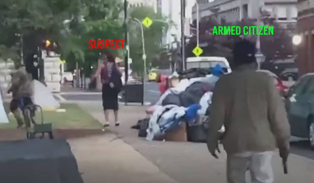 At the above video’s start, we see a man to the right who seems to be armed with a handgun, watching the suspect’s movements. Witnesses say the suspect is someone who had been kicked out of the protest site numerous times due to his behavior.