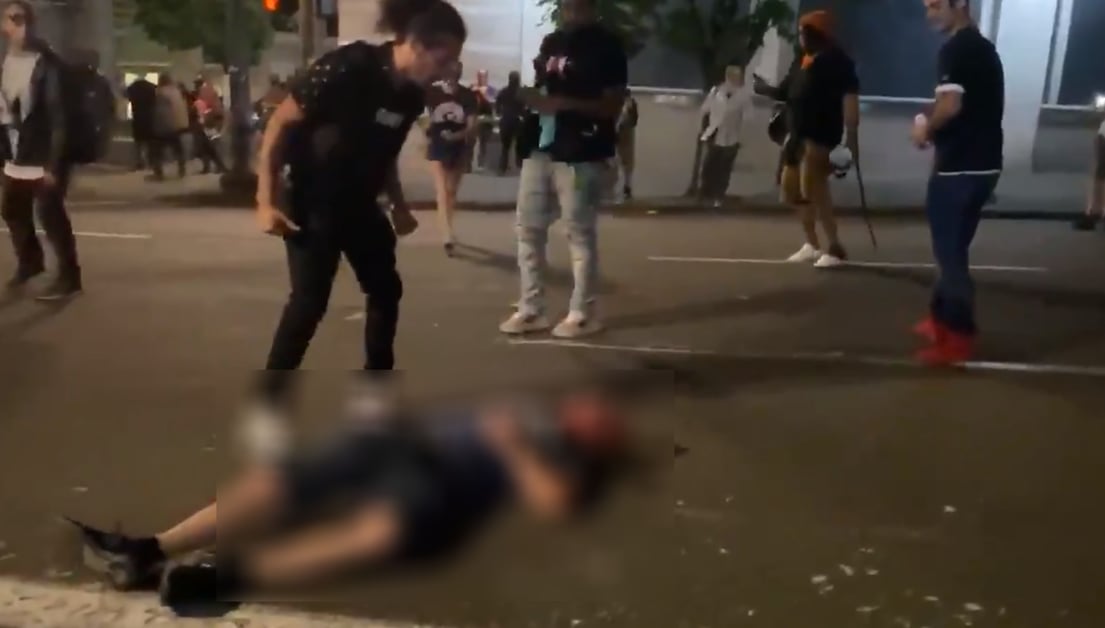 GRAPHIC: Rioters in downtown Portland detain man who had a car crash. They force him to sit on the ground while they search his belongings. One of them runs up and kicks him in the head, instantly knocking him out. There are no police. Video by @FromKalen pic.twitter.com/x646QheCV0