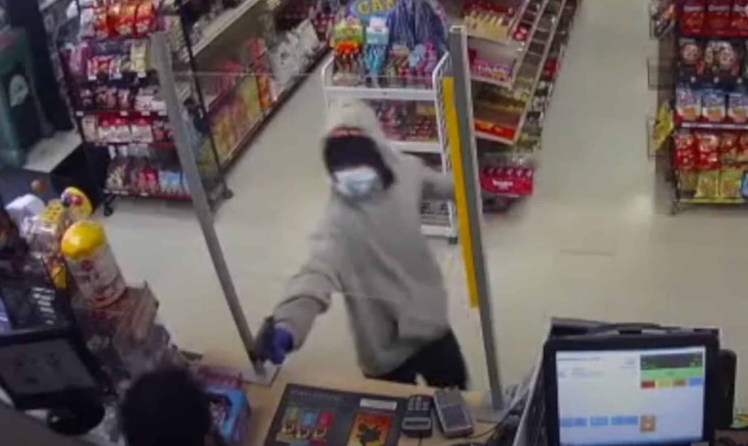 With no one else in the store, he immediately pulls a pistol from the pocket of his hoodie and points it at the clerk. The clerk runs from behind the counter with his own gun, forcing the robber to drop the gun, sit in the floor and raise his hands. When the clerk attempts to kick the gun away from the suspect, he picks it up and fires at the clerk, wounding him before fleeing the store on foot.