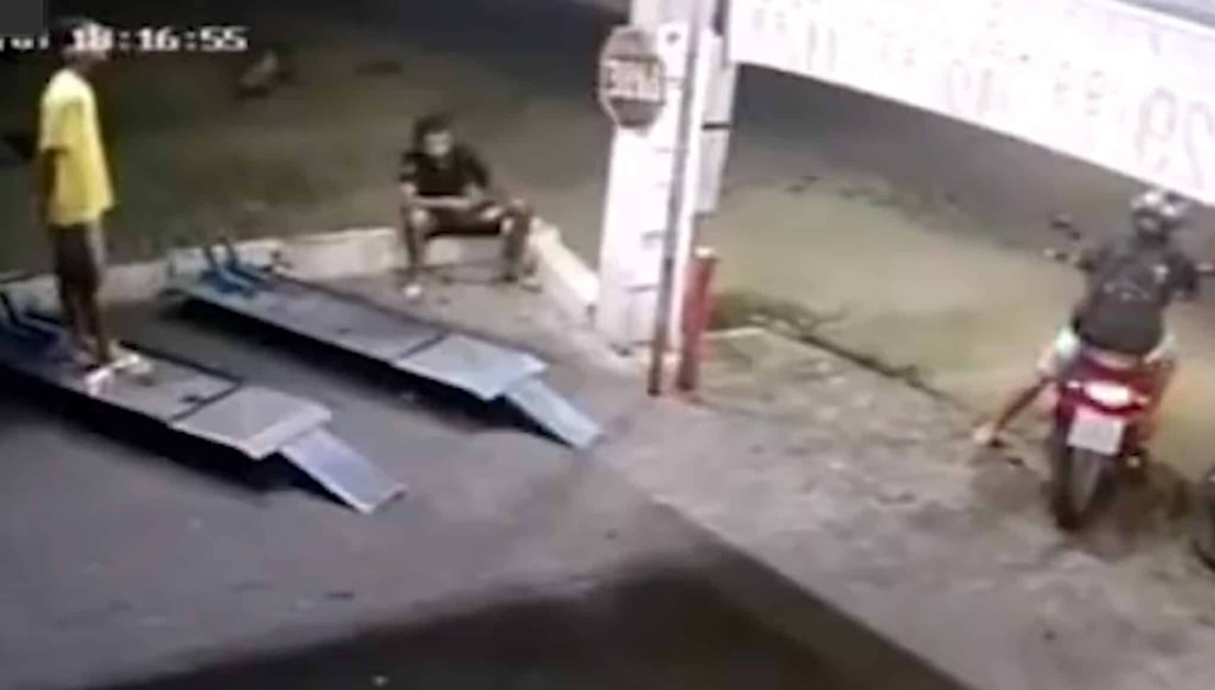 This attack, seemingly random, happened in Brazil as some people were hanging out at a shop. A couple of guys roll up on a motorcycle and stop next to the guy who is sitting on the ledge.