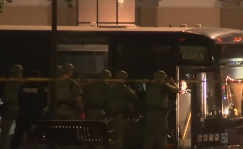 The suspect did not respond to officer’s commands and barricaded himself inside the bus. Hostage negotiators were called to the scene and communicated with him for two-and-a-half hours. When he finally began to exit the bus, he was still holding the knife and was struck by beanbags fired by police. After dropping the knife, he left the bus under his own power.